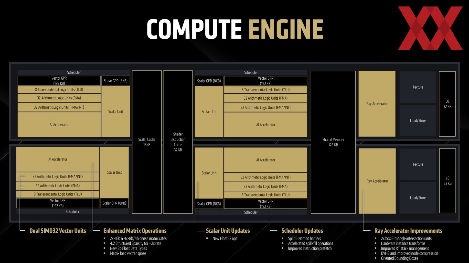 В вычислительных блоках (CU) мало что поменялось с возможностью выполнять две 32-битные векторные операции (Dual SIMD Vector Units). Матричные блоки теперь поддерживают двойные FP16-операции и умеют считать FP8 и FP4, удваивая или даже учетверяя их число по сравнению с FP16. Разреженность ускоряет обработку частично пустых матриц. Скалярные блоки, помимо 32-битных операций, освоили Float32.