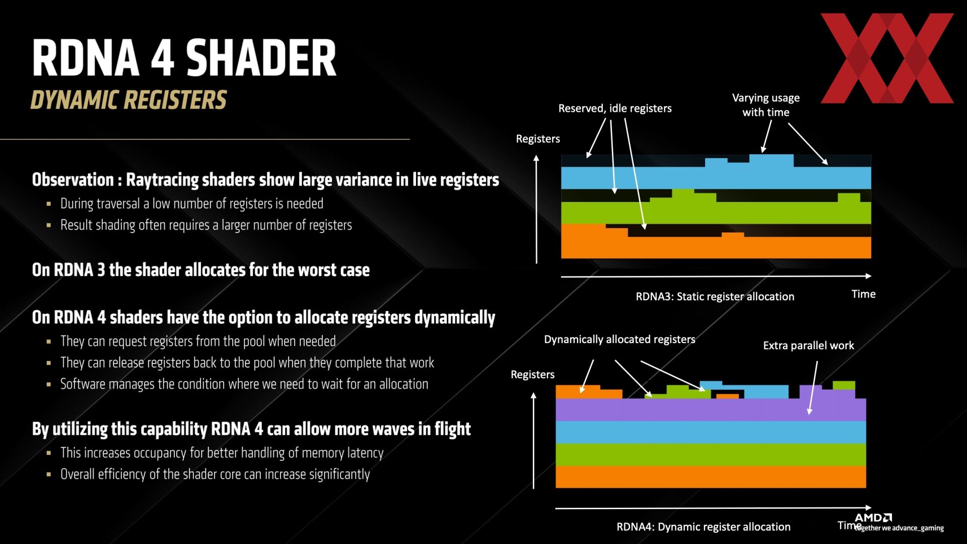 Асинхронность Out of Order Memory затронула и регистры шейдеров. RDNA-4 здесь тоже повысила производительность. Раньше шейдеры сами выделяли регистры под операции, бронируя максимум на худший случай. Теперь AMD распределяет их динамично — регистры работают эффективнее, вмещая больше одновременных вычислений.