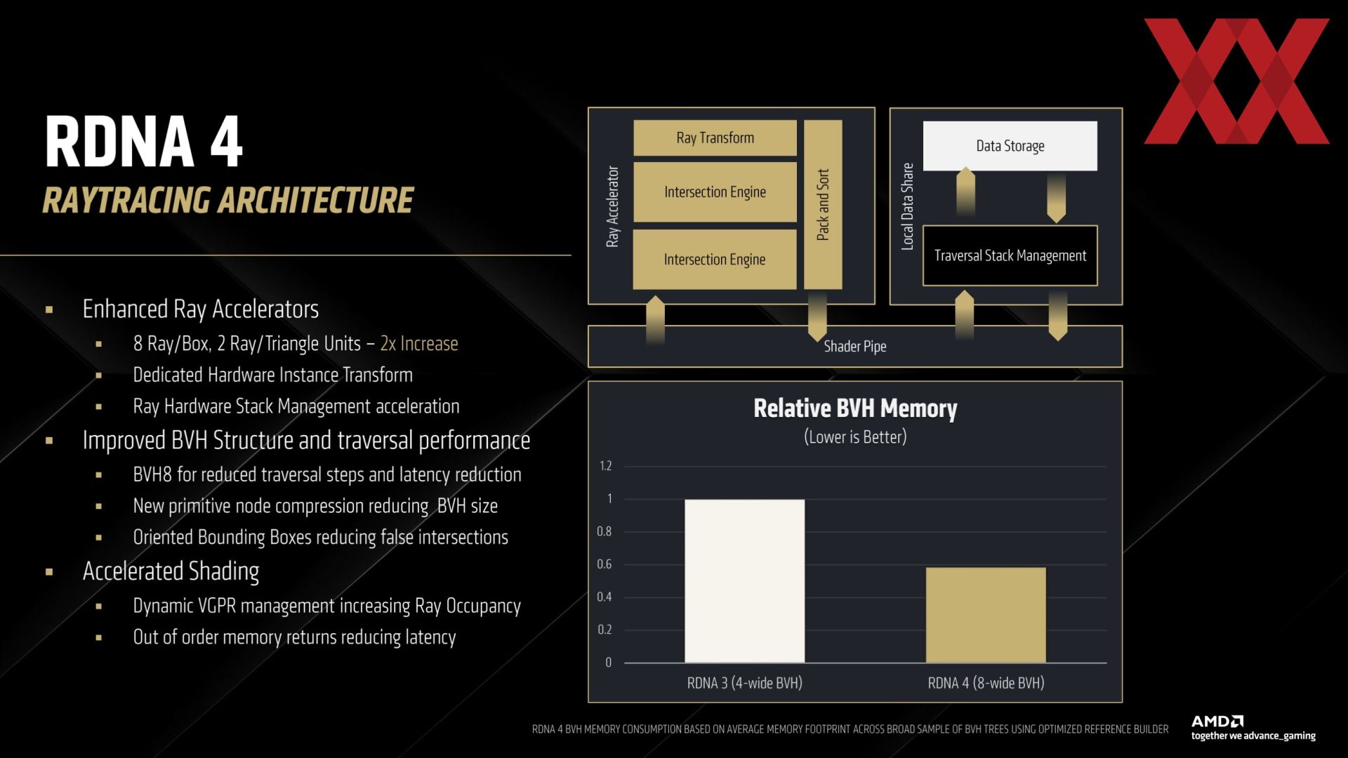 Улучшенные ускорители трассировки лучей считают вдвое больше лучей, чем в RDNA-3. AMD добавила им второй движок пересечений. Новый блок "Ray Transform" взял на себя вычисления, которые раньше нагружали шейдеры в RDNA-3. Это разгружает шейдеры и поднимает их производительность. Ускорители получают данные из общего кэша на 128 кБ для парных CU.