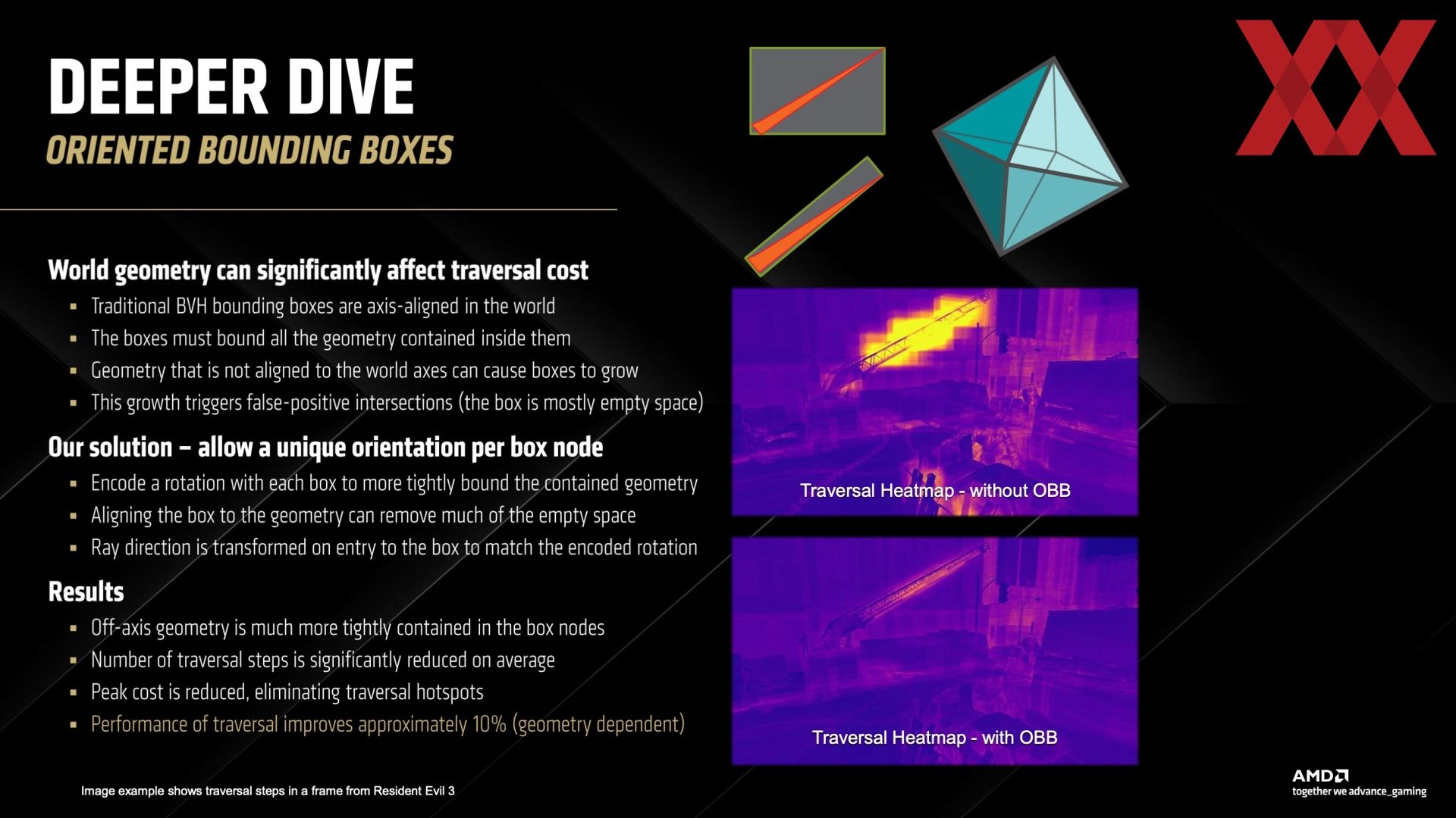 Новинка в BVH — ориентированные граничные блоки (Oriented Bounding Boxes, OBB). Они подстраиваются под геометрию сцены, убирая пустоты и следуя 3D-формам. Лучи быстрее отсекаются, если не попадают в объекты, — это замечают раньше. AMD хвалится приростом мощности на 10% благодаря OBB.