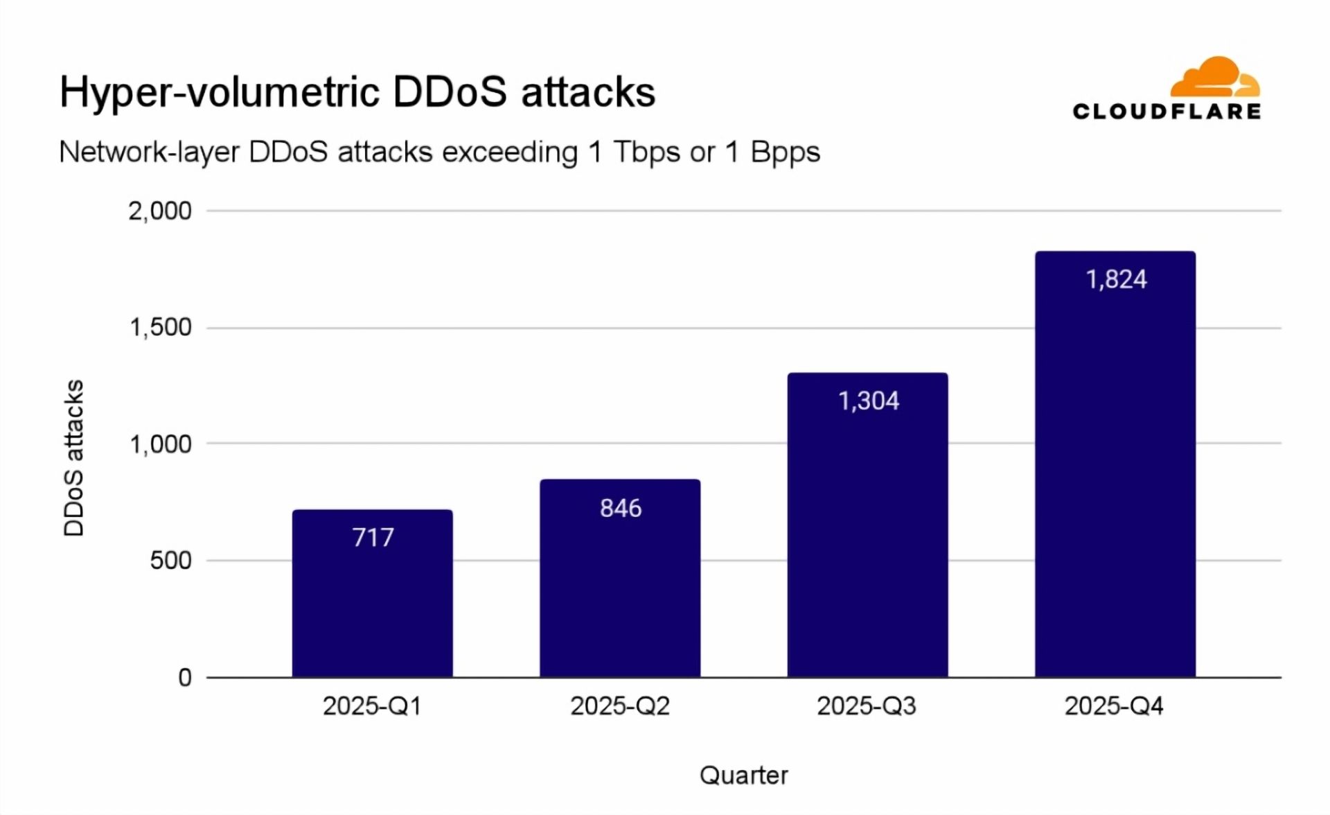 Cloudflare опубликовала отчет об угрозах DDoS за четвертый квартал 2025 года. Согласно данным компании, в 2025 году количество DDoS-атак, зафиксированных в сети Cloudflare, выросло до 47,1 млн — это на внушительные 121 % больше, чем в 2024 году. В среднем Cloudflare блокировала 5 376 атак каждый час. Самый резкий рост пришелся на DDoS-атаки на сетевом уровне: за последние двенадцать месяцев их число увеличилось более чем втрое. Если в 2024 году Cloudflare зарегистрировала 11,4 млн сетевых атак, то в 2025-м их стало уже 34,4 млн.