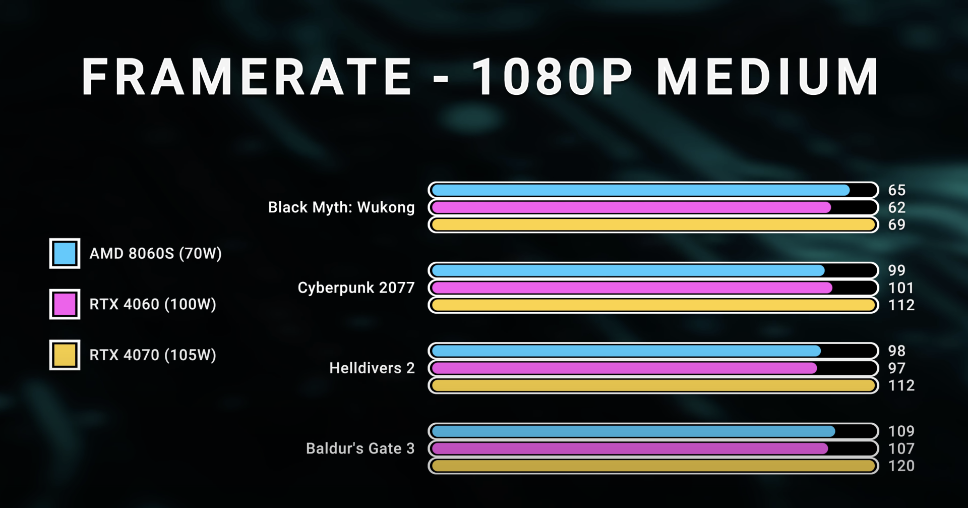 Главное преимущество Strix Halo — мощная встроенная графика на архитектуре RDNA 3.5 с 40 вычислительными блоками (CU), которая весьма близка к дискретным видеокартам. В режиме 70 Вт встроенная Radeon RX 8060S показывает результаты на уровне GeForce RTX 4060 Laptop GPU (100 Вт), а в некоторых случаях приближается к GeForce RTX 4070 Laptop GPU (105 Вт). Неясно, проводились ли тесты с FSR 3 и DLSS 3 или без них. Если тестирование делали без апскейлинга, то потенциал Ryzen AI Max+ 395 с Radeon RX 8060S может оказаться весьма впечатляющим. APU будет конкурентоспособным даже по сравнению с дискретными видеокартами в игровых ноутбуках.